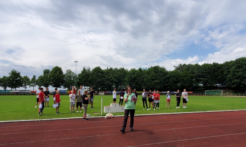 Dazu fanden sich alle anwesenden Schüler und Lehrer am 4. Juli am frisch renovierten Sportzentrum in Wiesau ein. Nach einem ausführlichen Aufwärmprogramm verteilten sich die Riegen - einem wie gewohnt von Frau Kinle straff durchorganisierten Zeitplan folgend - auf die verschiedenen Wettkampfstellen.