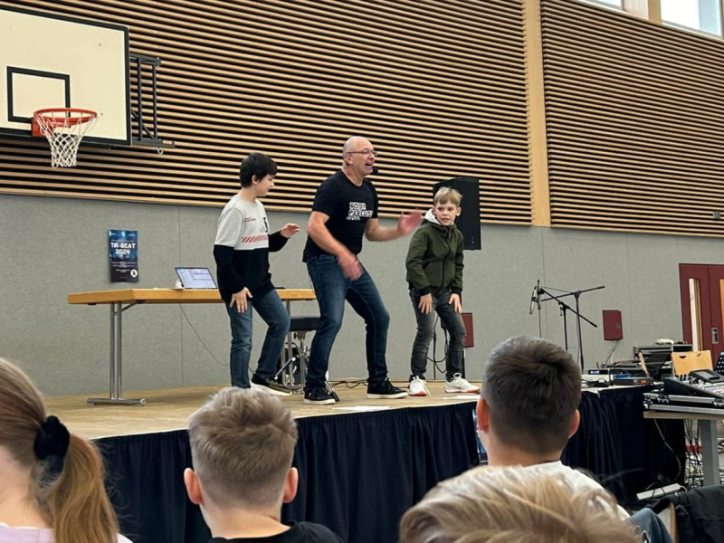 In Kemnath angekommen wurden die Schüler aus elf verschiedenen Schulen des Landkreises von Schulamtsdirektorin Martina Puff, welche auch durch das Programm führte, begrüßt. Der österreichische Komponist, Musiker, Schlagzeuger, Musiklehrer und Autor Richard Filz zeigte auf der Bühne zuerst die Grundelemente der Percussion, welche die 600 Schüler (= Groover) Schritt für Schritt nachmachen konnten. Den anfänglichen Übungen wie Stampfen nur mit den Füßen, Patschen auf der Brust und Schnipsen mit den Fingern folgten bald immer anspruchsvollere Rhythmusübungen. Dies verlangte eine sehr konzentrierte Aufmerksamkeit, denn Bodypercussion ist mehr als nur eine musikalische Ausdrucksform. Sie fördert die Wahrnehmung des eigenen Körpers und der individuellen Koordination. Bald entstanden dadurch coole Moves und eine effektvolle Body- Percussion- Choreografie. Am Schluss waren sich alle Schüler einig, dass dies eine klasse Aufführung war.